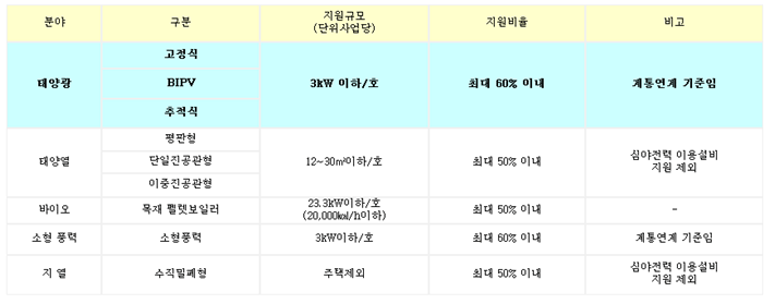 2020년까지 신재생에너지주택(Green home) 100만호 보급을 목표로 추진하는 사업으로 태양광, 태양열, 지열, 소형풍력,바이오 등의 신ㆍ재생에너지원을 일반주택 및 공동주택에 설치 시 설치비의 일부를 무상 지원하는 사업입니다.