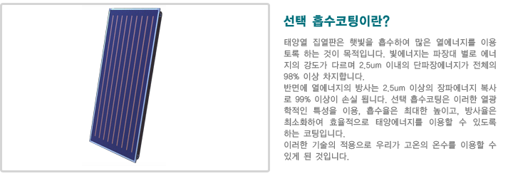 최고효율 선택흡수코팅판을 적용하여 집열기 효율효율부분 FRta = 0.75, FRULL= 4.65달성