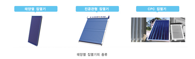 태양열집열기는 형태에 따라서 평판형 집열기,진공관형 집열기,CPC집열기로 구분할 수 있습니다.평판형집열기