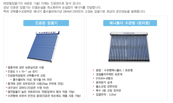 판형의 집열기로써 신뢰성이 높으며, 흡수판 면적이 넓기 떄문에 집열초기 효율이 높고, 강화유리의 강도가 높아 충격에 강하며 대규모 설비공사 시 설치인건비가 비교적 적게 소요된다.