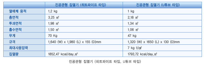 단열손실을 줄이기 위해 진공기법을 적용한 제품으로 특수용도의 집열기로 사용되고 있다, 특히 태양열 냉방등 고온의 온수가 필요한 장소에 적합한 제품이다. 단점으로는 흡수판 면적이 다소 적기 때문에 초기 효율이 평판형에 비하여 낮다. 또한 충격에 약하고 설치비가 다소 많이 소요되는 특징이 있다.